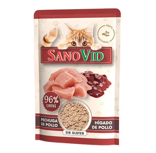 La sabrosa Delicia Pollo Campestre Sanovid, elaborada con pechuga e hígado de pollo, ofrece un sabor intenso y auténtico.