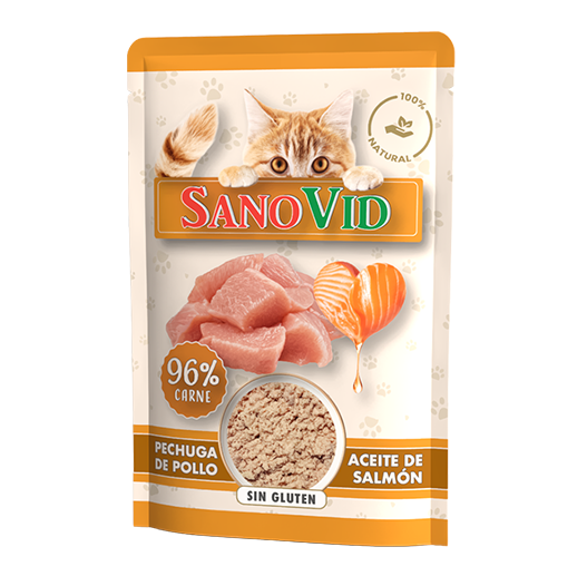 La irresistible Delicia al Salmón de Sanovid, con su textura suave y jugosa en cada bocado, es la opción perfecta para los gatos más exigentes.